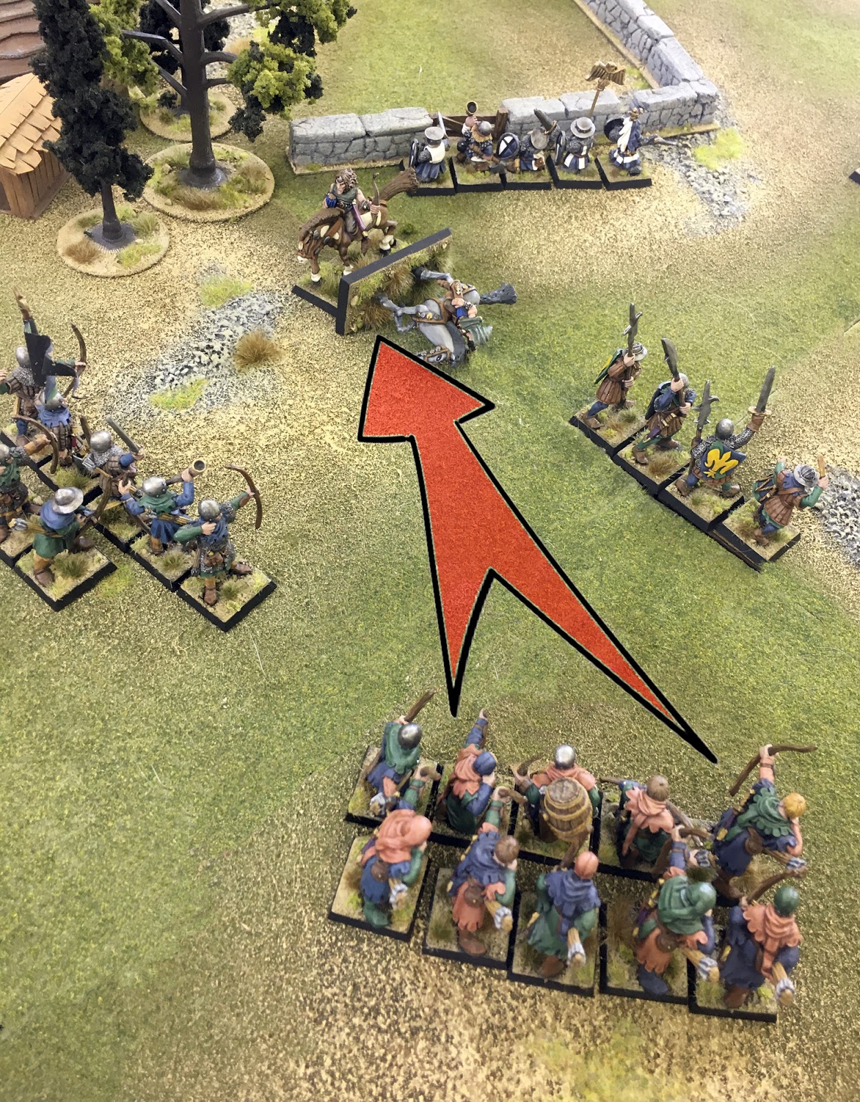 The human archers, which now formed the left flank of the human line, loosed an ineffective volley at the mounted rangers and then moved forward to close up on the left flank of the halberd unit.